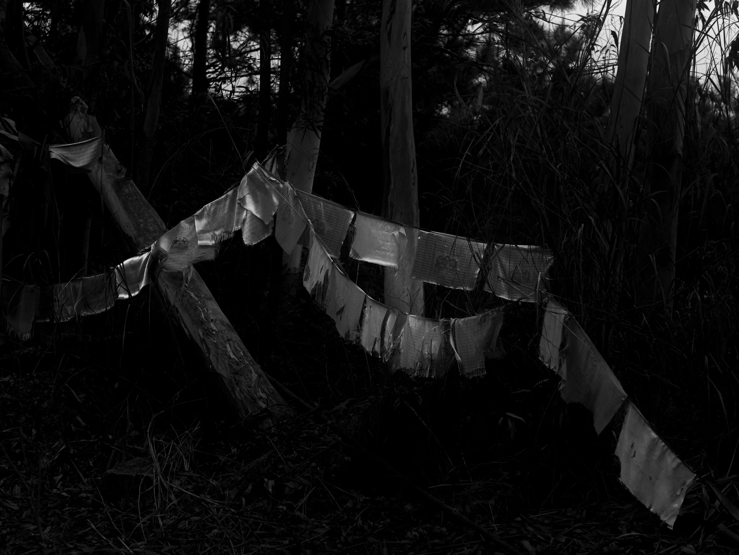As I started working in the shadows of the densely overgrown rainforest, elements emerged gradually, like memories of a collective unconscious: the curve of an ancestor’s headstone, Buddhist flags suspended in murky light, offerings left during Tomb-Sweeping Day (Qingming Jie) when families tend graves otherwise forgotten for the rest of the year.